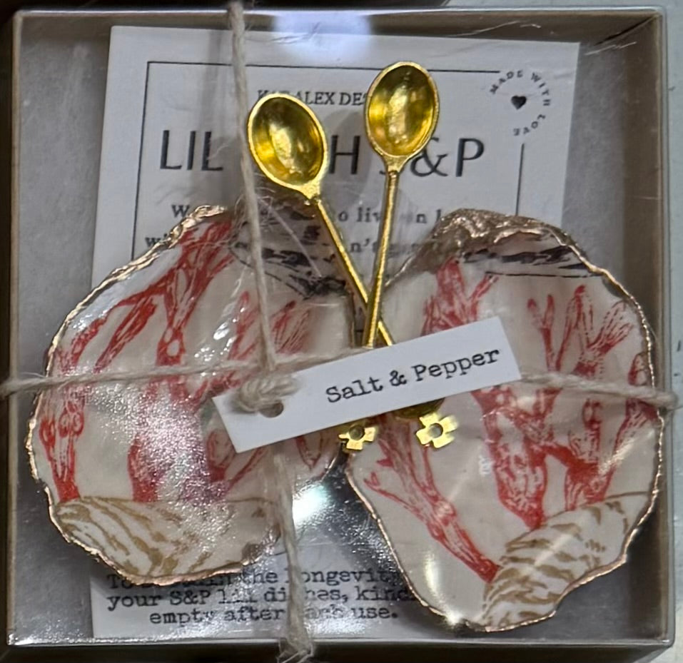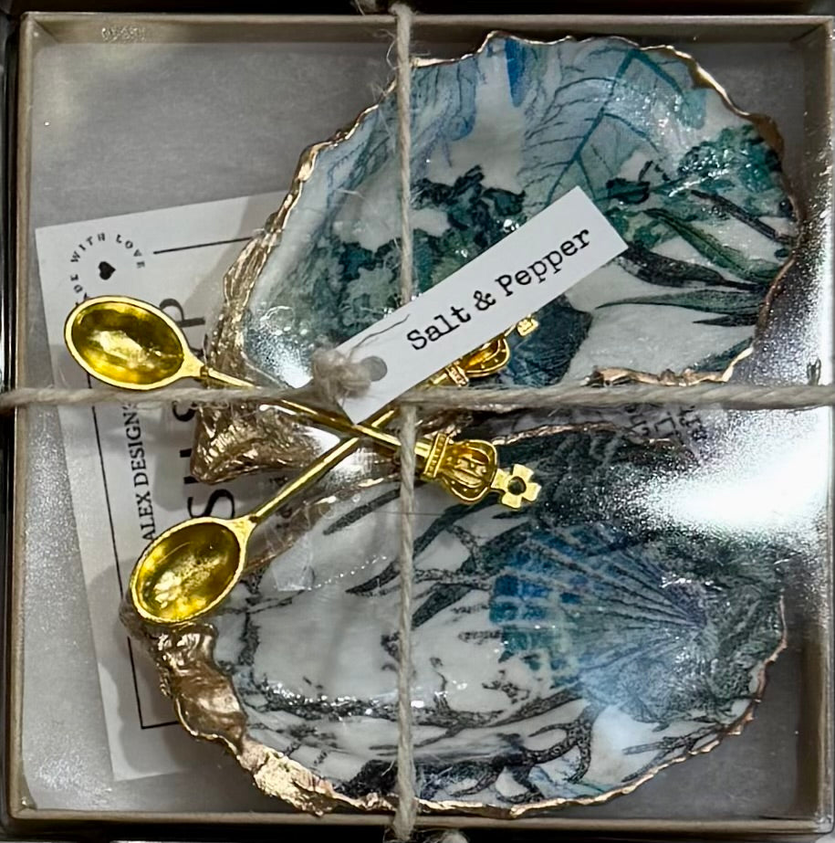 Bring coastal charm to your table with these unique salt and pepper cellars, made from real oyster shells by local artisan Kat Alex. Each shell is carefully cleaned, sealed, and lined with beautiful, one-of-a-kind designs—no two are alike. Whether it’s subtle shimmer or a playful print, every set has its own personality.