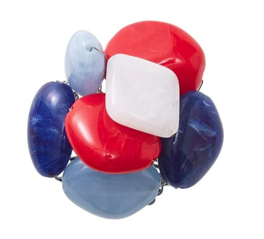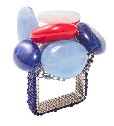 The Sea Stone Napkin Ring in seafoam features aquatic shades of seafoam and teal resin stones set in clusters. These sea-inspired napkin rings are reminiscent of tumbled stones found upon the shore. Arranged at random, the stones are mounted on a beautifully beaded napkin ring. These nautical beaded napkin rings are the perfect addition to a bright and cheery table